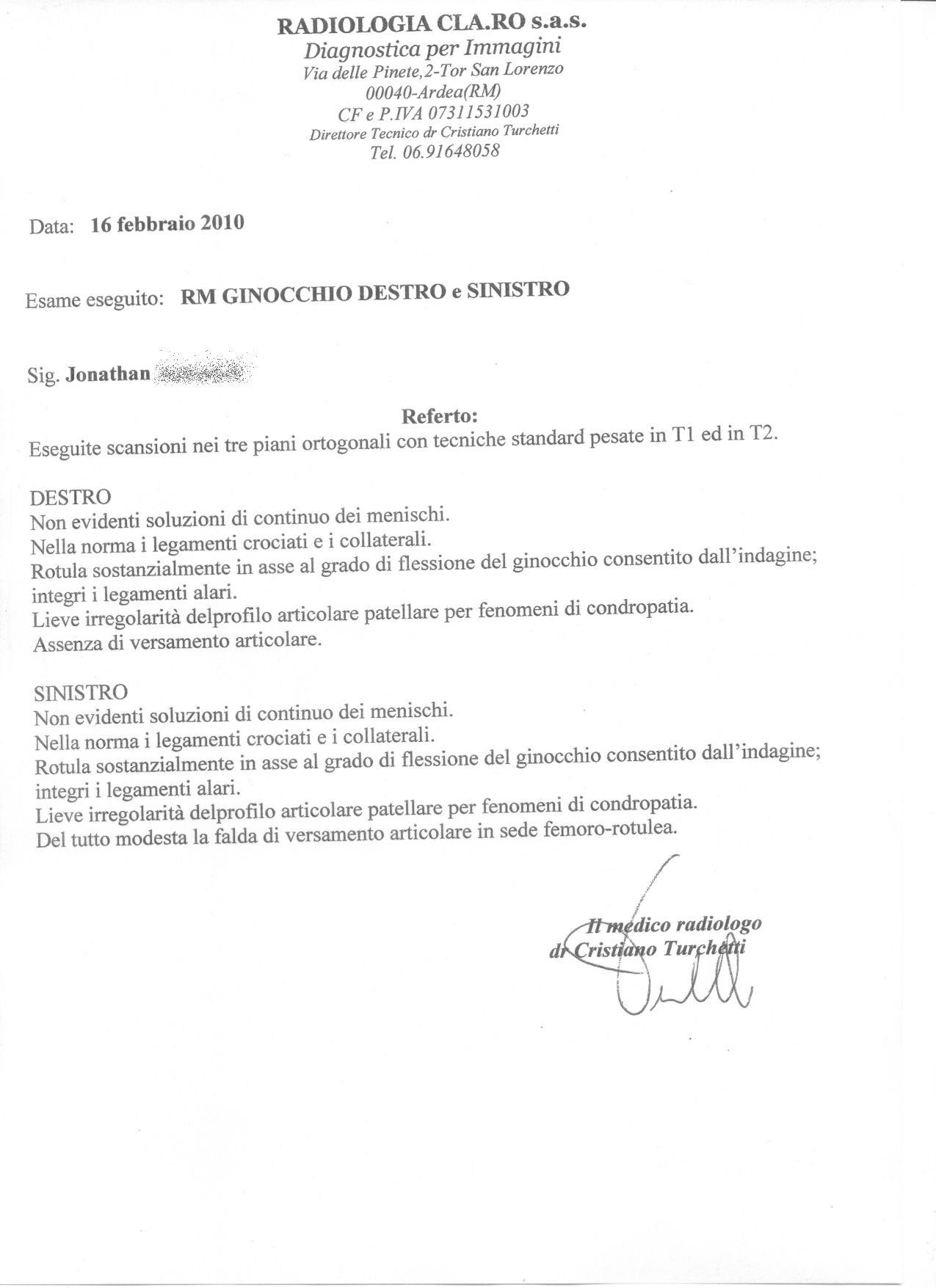 Rm ginocchio destro e sinistro del 16 febbraio 2010