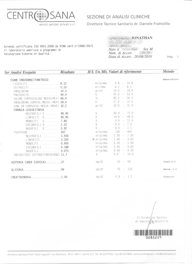 Esami del sangue e delle feci del 20 agosto 2010 (pag.1/3)