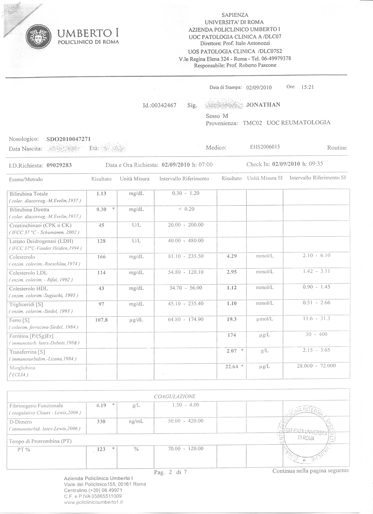 Cartella clinica Umberto Primo (pag.37/43) – Esami del sangue